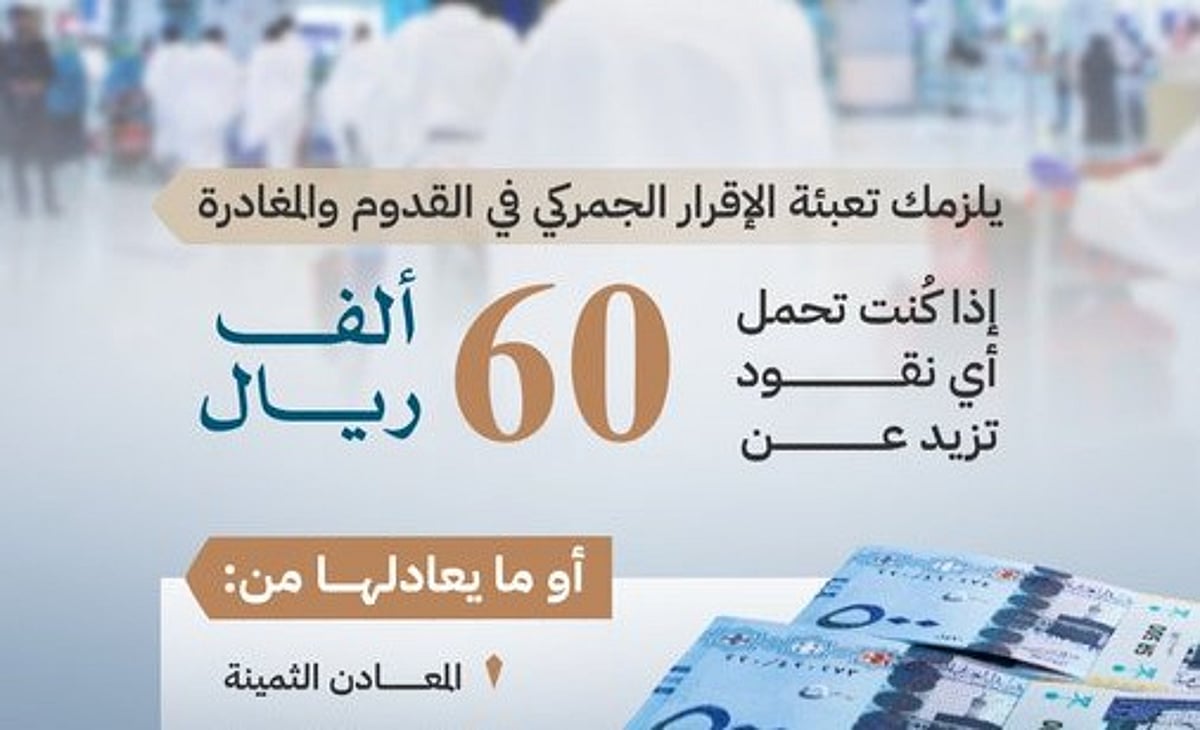 الإقرار الجمركي إلزامي عند حمل مبالغ أو مقتنيات تتجاوز 60 ألف ريال