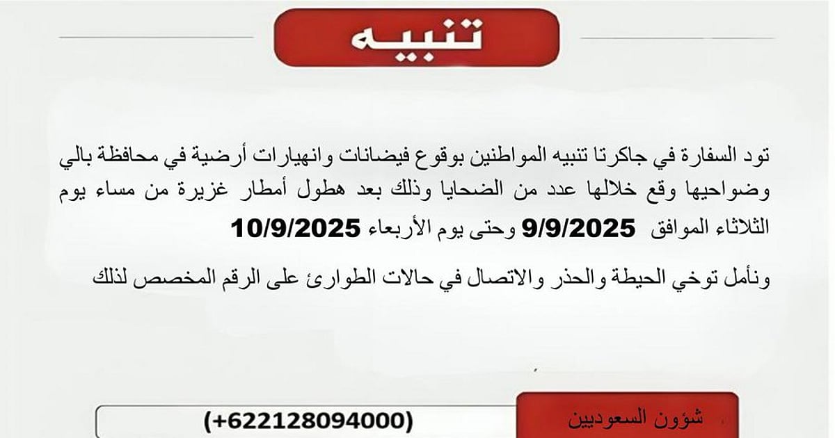 أصدرت سفارة المملكة العربية السعودية لدى إندونيسيا تنبيهًا للمواطنين بوقوع فيضانات وانهيارات أرضية في محافظة بالي ومناطقها، أسفرت عن عدد من الضحايا، وذلك عقب هطول أمطار غزيرة منذ مساء أمس الثلاثاء وحتى اليوم الأربعاء.