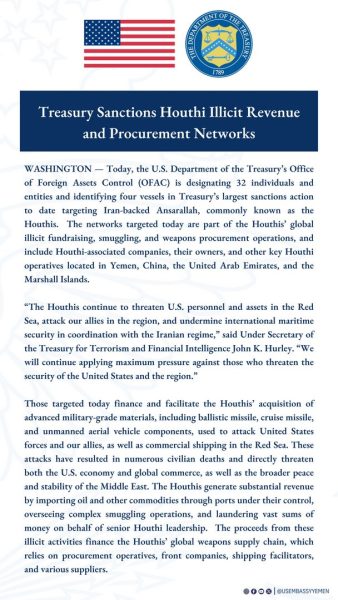 وأعلنت وزارة الخزانة الأمريكية في بيان، أنها فرضت عقوبات على 32 فرداً وكياناً بالإضافة إلى 4 سفن، في محاولة لتعطيل عمليات جمع الأموال والتهريب والهجمات التي يقوم بها الحوثيون.