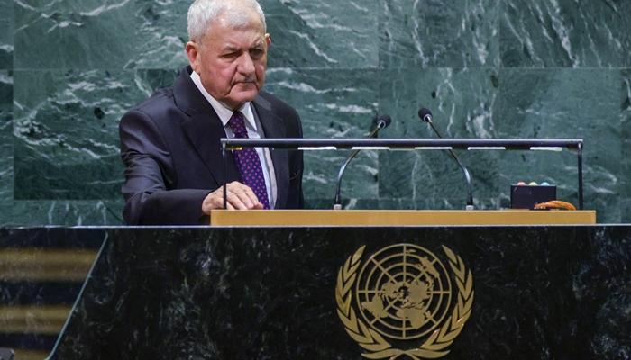 وأبدى الرئيس العراقي استعداد بلاده لأن يكون نقطة وصل بين الشرق والغرب، في كلمته أمام الجمعية العامة للأمم المتحدة، مطالبًا بدعم المجتمع الدولي لإعادة الإعمار في بلاده.