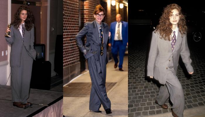 تقول روبرتس إنها ما زالت تحتفظ بتلك السترة ذات الأزرار الثلاثة والبنطال واسع الخصر. وخلال مقابلة مع فريق عمل فيلمها After the Hunt، استعادت تفاصيل شرائها: “دخلت متجر أرماني، وكان قسم النساء في الطابق السفلي، لكنني صعدت مباشرة إلى قسم الرجال. أتذكر أنني جرّبت البدلة هناك، ووقعت في حبها على الفور”.