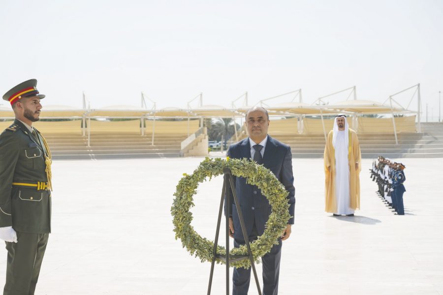 واستعرض معالي رئيس الوزراء اليمني، يرافقه سموّ الشيخ ذياب بن محمد بن زايد آل نهيان، حرس الشرف الذي اصطفَّ لتحيته، ثمَّ وضع إكليلاً من الزهور أمام نصب الشهيد.