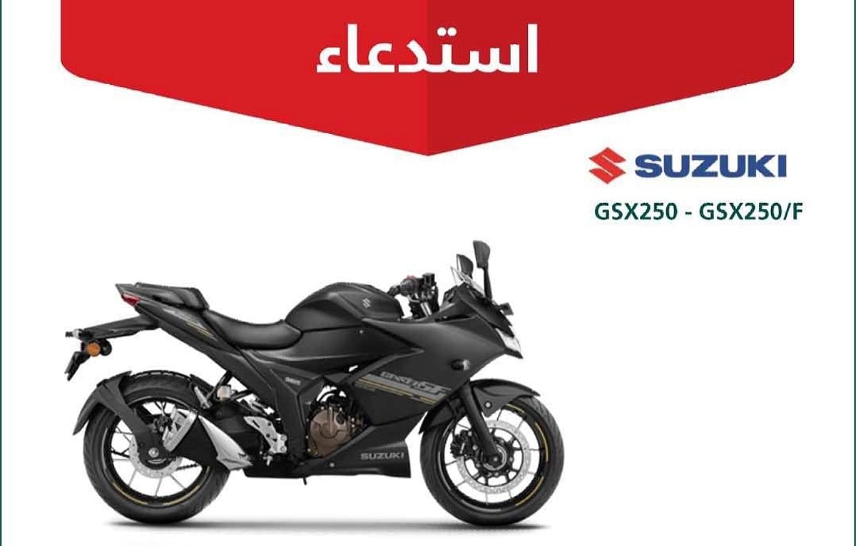 أعلنت وزارة التجارة عن استدعاء (1316) دراجة نارية من طراز سوزوكي (GSX250 – GSX250/F)، والمصنّعة خلال الأعوام 2022 – 2025، بسبب خلل في المكابح الخلفية (الكليبر) قد يؤدي إلى ضعف أداء عمل الفرامل، مما يزيد من احتمالية خطر وقوع حادث.