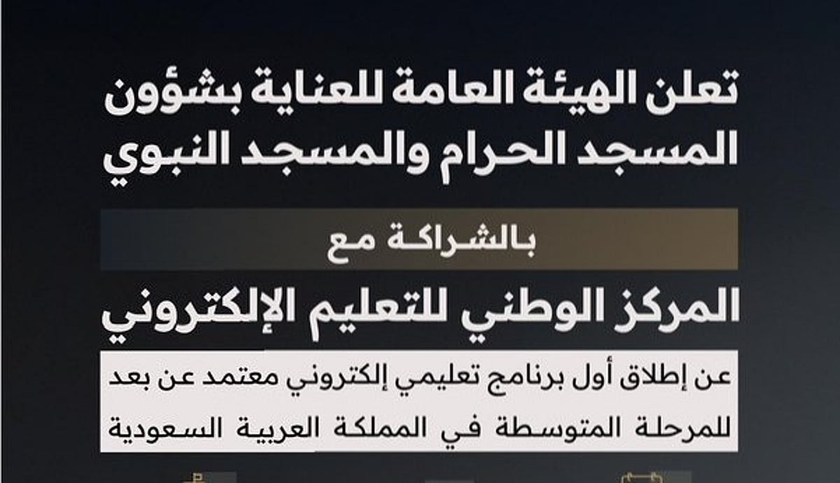 أعلنت الهيئة العامة للعناية بشؤون الحرمين الشريفين، بالشراكة مع المركز الوطني للتعليم الإلكتروني، عن فتح بوابة القبول في أول برنامج تعليمي إلكتروني (عن بُعد) معتمد للمرحلة المتوسطة بمعهد الحرم المكي الشريف.