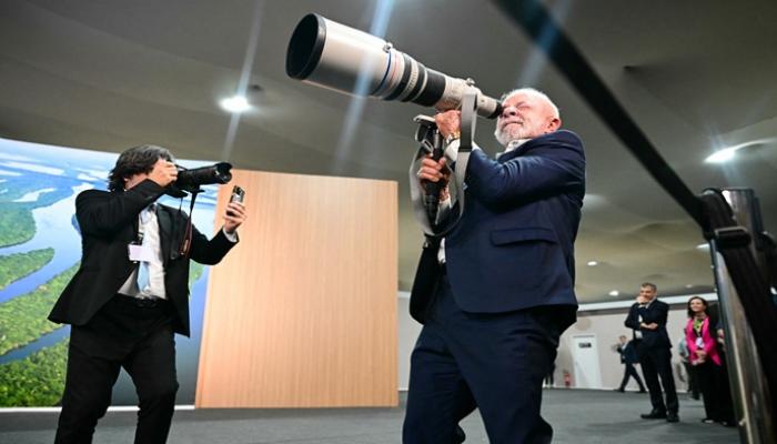 ظهَر الرئيس البرازيلي لويس إيناسيو لولا دا سيلفا من خلال لقطة فوتوغرافية لافتة، وهو ينظر عبر عدسة كاميرا قبيل مؤتمر صحفي خلال مؤتمر الأمم المتحدة لتغير المناخ COP30 في مدينة بيليم.