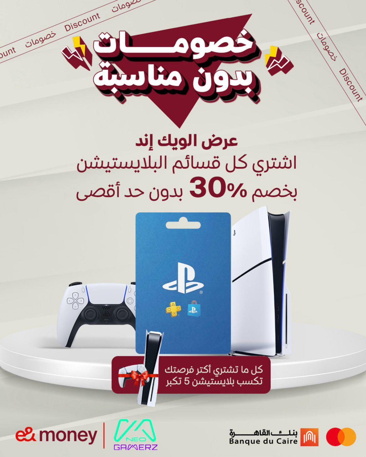 عرض الويك إند من e& money و NEO Gamerz خصم %30 بدون حد أقصى لكل قسائم العاب البلايستيشن لما تشتري بمحفظتك من موقع NEO Gamerz مع عرض e& money