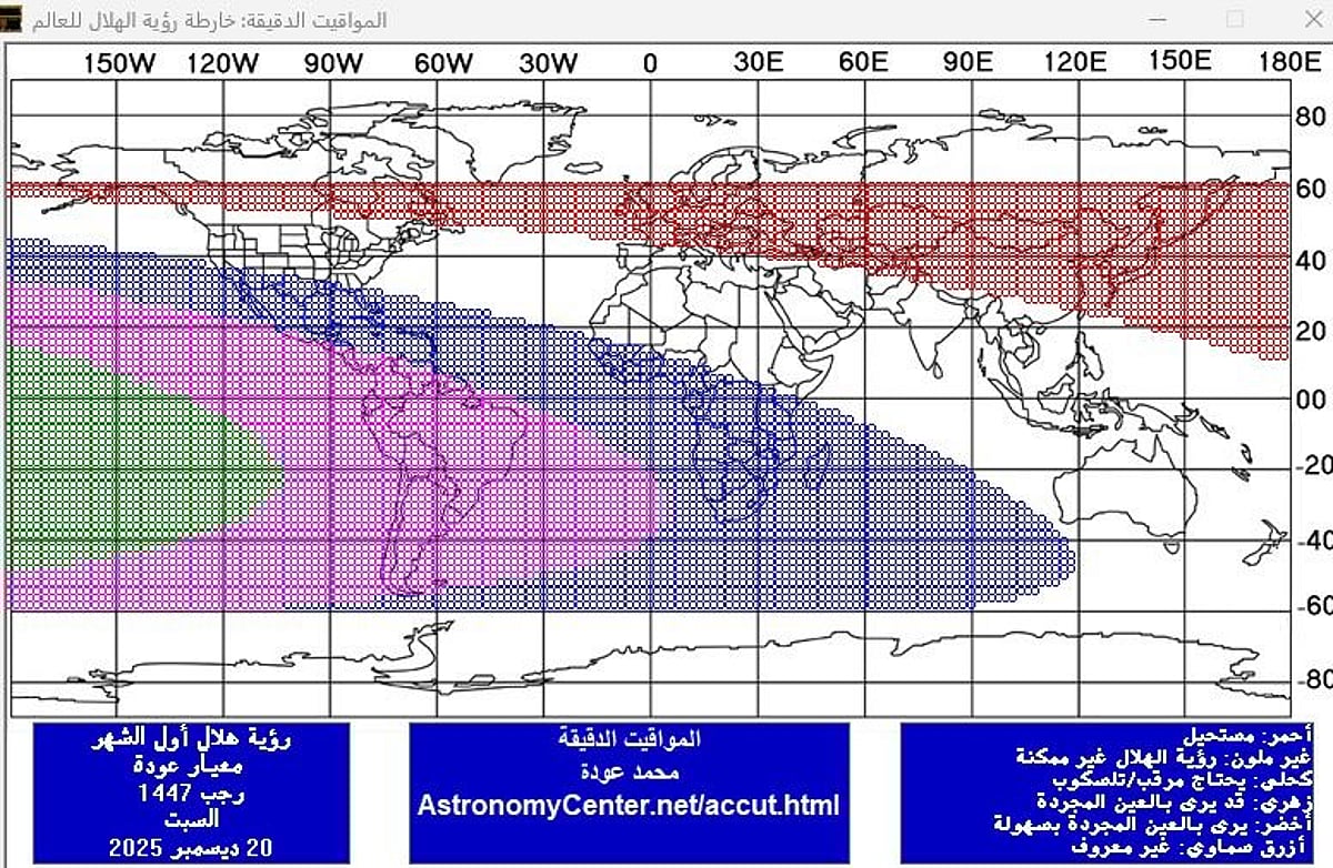قال ، المهندس محمد شوكت عودة ، مدير مركز الفلك الدولي : ستتحرى معظم الدول الإسلامية هلال شهر رجب 1447 هـ يوم السبت 20 ديسمبر 2025م، وسيحدث الاقتران المركزي في نفس اليوم في الساعة 01:43 صباحًا بتوقيت غرينتش، ورؤية الهلال بعد غروب شمس يوم السبت ممكنة باستخدام التلسكوب من جنوب وجنوب غرب القارة الإفريقية ومن أمريكا الجنوبية، في حين أن رؤية الهلال ممكنة بالعين المجردة من غرب أمريكا الجنوبية والمحيط الهادئ، ونظراً لأن هناك إمكانية لرؤية الهلال من أجزاء من العالم الإسلامي فإن العديد من تقاويم الدول الإسلامية تجعل يوم الأحد 21 ديسمبر أول أيام شهر رجب. وفيما يتعلق بالبداية الفعلية لشهر رجب فهو من اختصاص الجهات الرسمية في كل دولة بعد استلام نتائج تحري الهلال في كل منها.