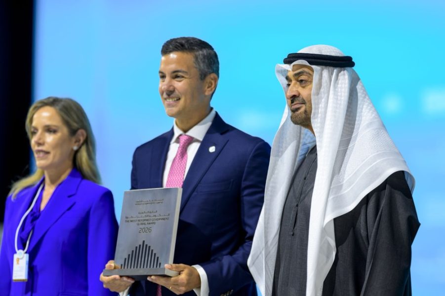 سلم صاحب السمو الشيخ محمد بن زايد آل نهيان رئيس الدولة “حفظه الله”، فخامة سانتياغو بينيا بالاسيوس رئيس جمهورية الباراغواي، الجائـــزة العالمية للحكومات الأكثر تطوراً، إحدى أرفع جوائز القمة العالمية للحكومات، وذلك ضمن فعاليات القمة التي تعقد في دبي خلال الفترة من 3 إلى 5 فبراير الحالي، بمشاركة عالمية رفيعة المستوى.