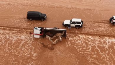 شاهد.. انقلاب شاحنة محمّلة بالإبل في وادي الطوقي بسبب السيول الجارفة